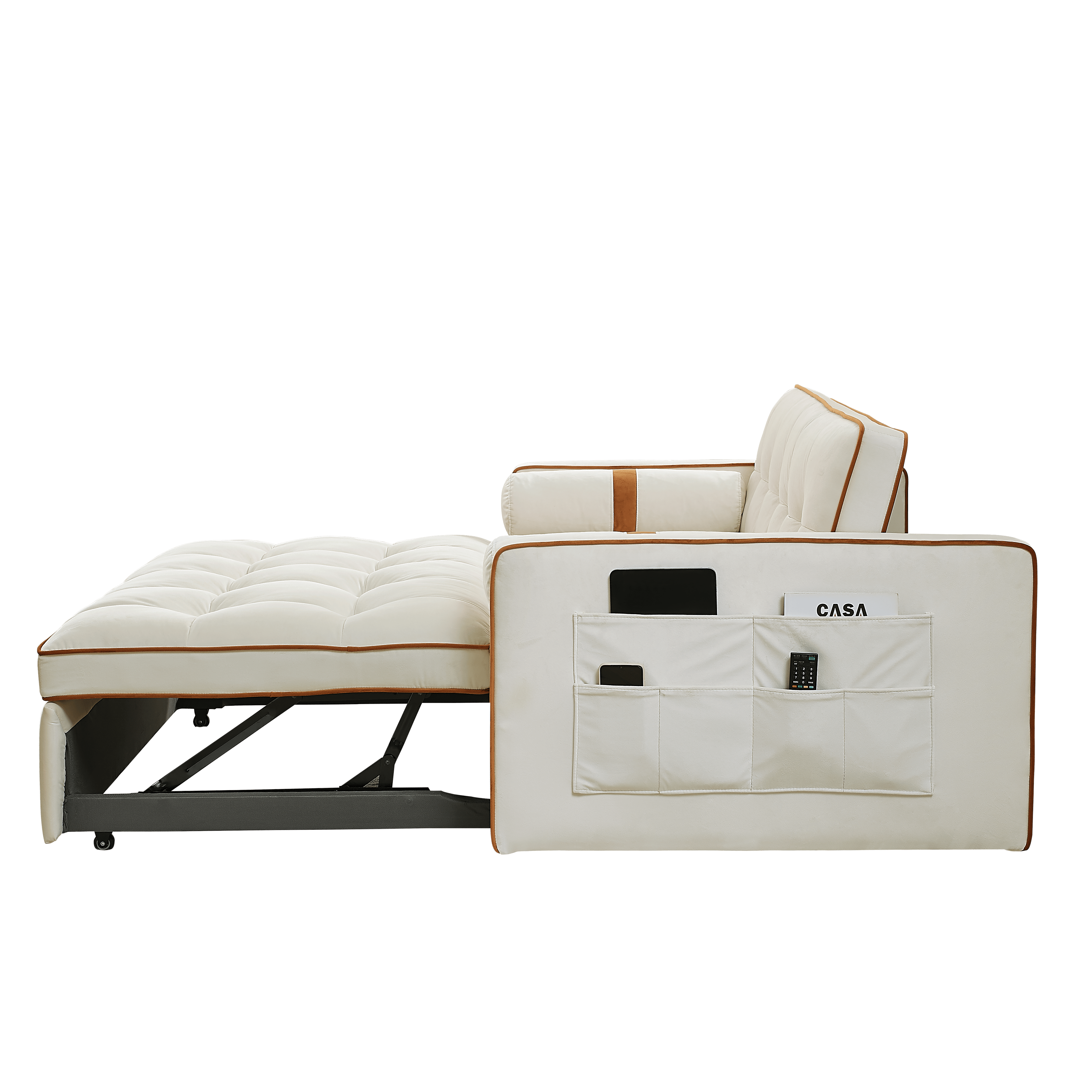 1. Multifunctional pull-out sofa bed. By pulling out and lifting the bed frame under the seat and lowering the backrest, this double position sofa can be quickly converted into a bed for resting use.2. Adjustable and super strong: soft high-grain velvet fabric and high-density foam, the backrest can be adjusted to 3 positions, 105°-180° recline or lie flat, it can be used for listening, playing games, reading, and sleeping. It will make you feel relaxed and comfortable.3. Suitable for any scene: this multifunctional pull-out sofa bed can be placed in living room and bedroom, it can accommodate 2 people to watch TV, play games or read, it can be used for guests or children's bed, modern design and space saving. This is definitely a good choice for applicable small rooms, apartments, studios, offices.4. Perfect function: it has two straps to assist pull out can quickly turn the sofa into a bed. Pull-out with a bed made of high quality foam and metal iron frame can steadily support you to lie on the bed.5. storage pockets and soft pillows. Our sofa comes with two side storage bag for you to reach and use to store your TV remote, cell phone, glasses or books. Also includes two soft pillows for added back support or sleep.6. Easy to assemble and use. Easy-to-follow instructions ensure the perfect build and pull-out recliner setup is quick and easy. If you need a video, please contact me.